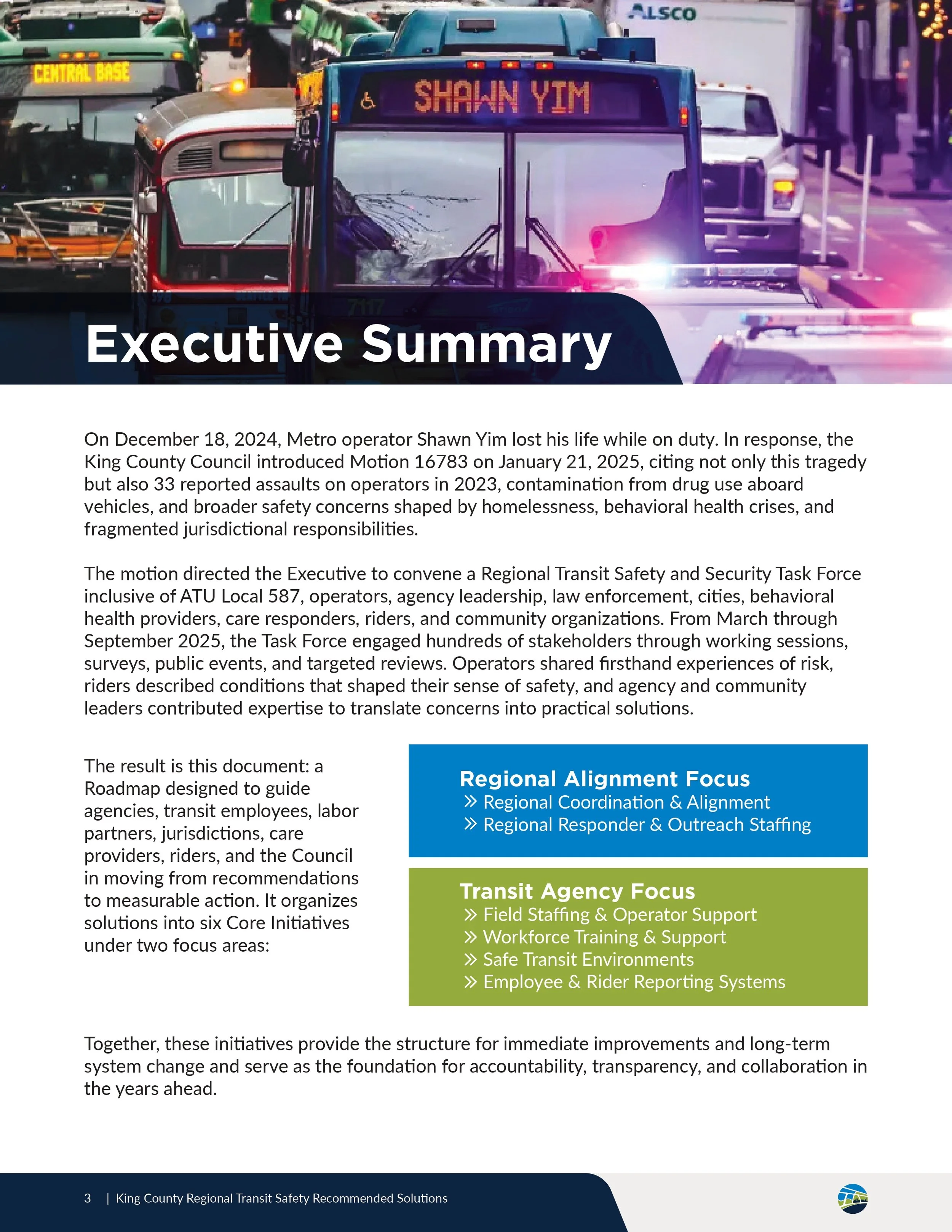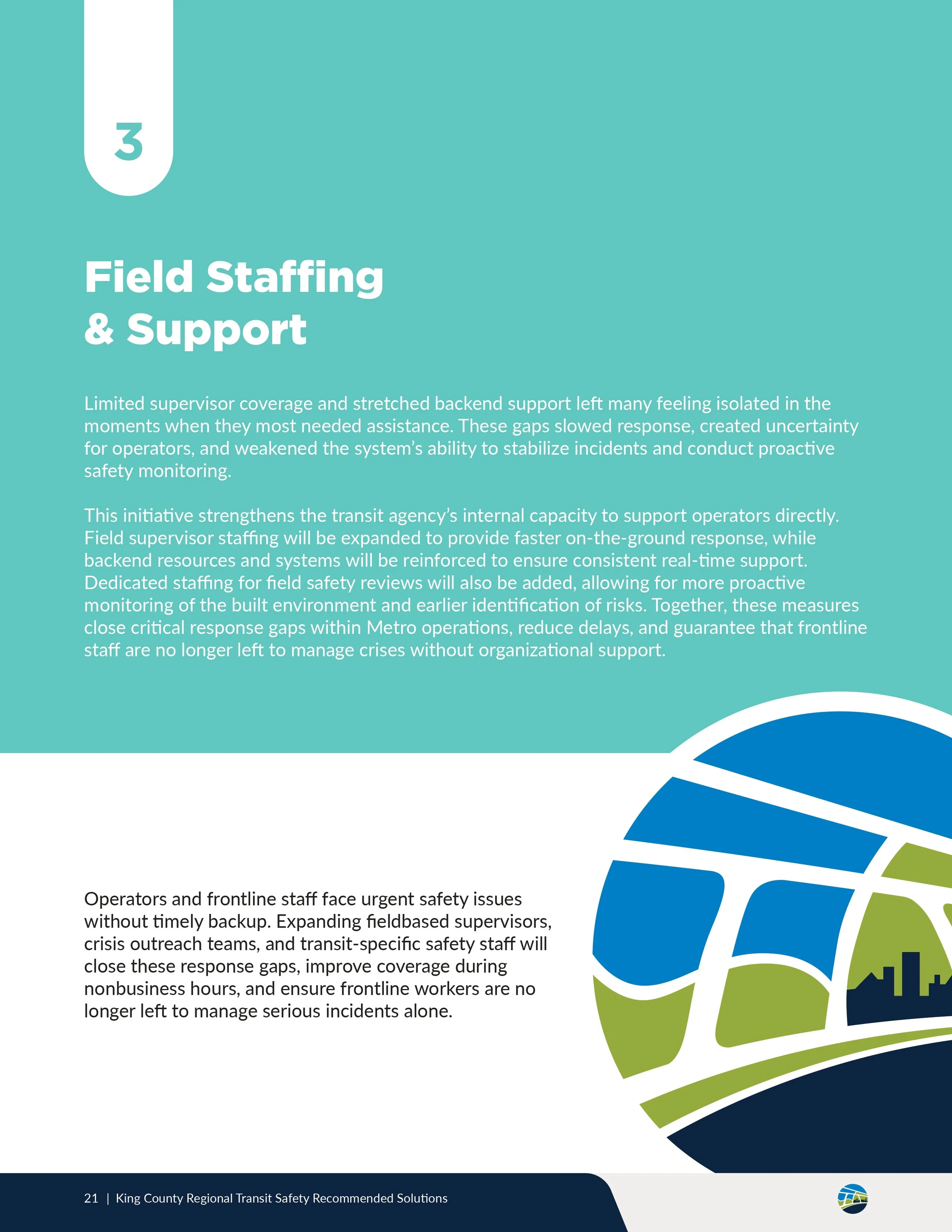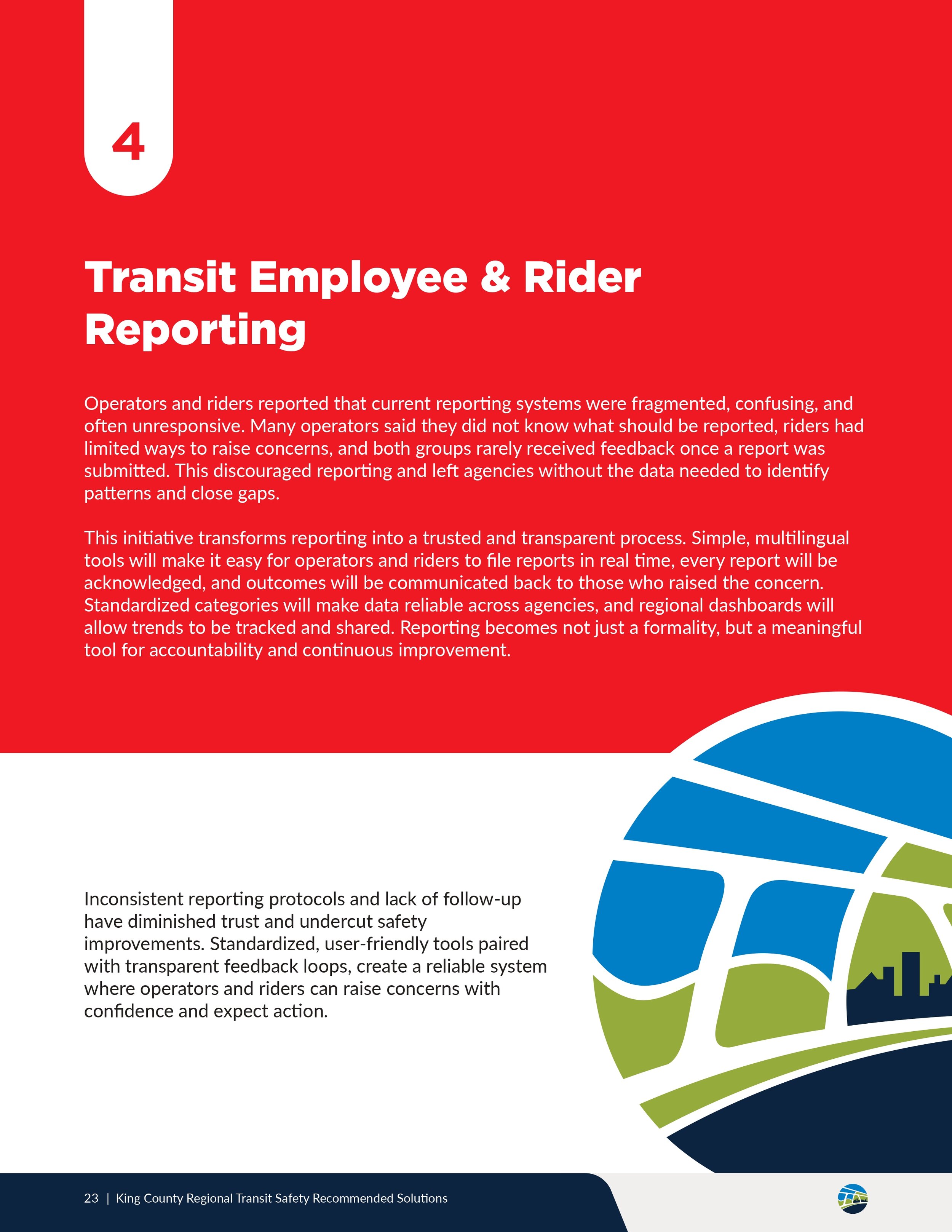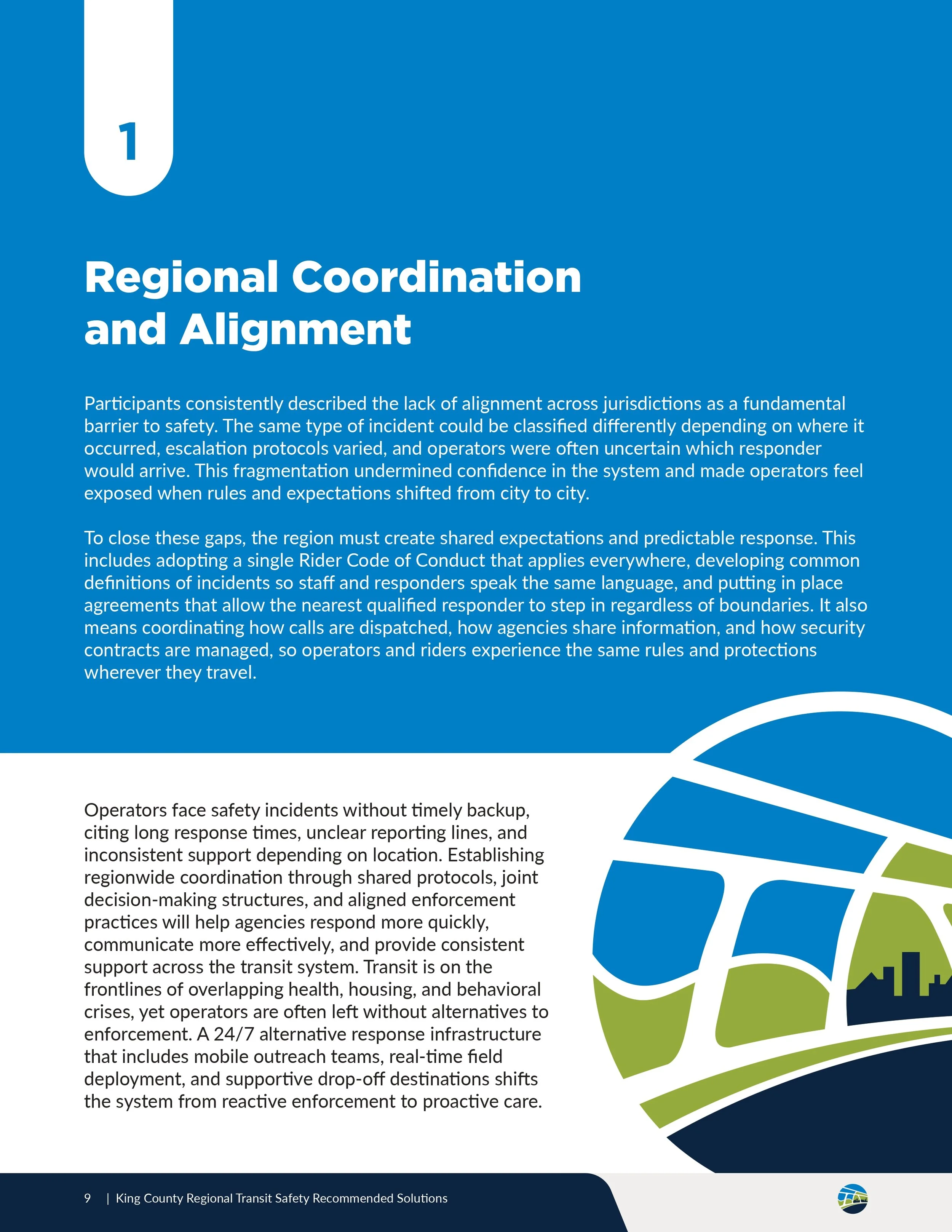 The Recommended Solutions publication documents more than 150 regionally generated recommendations developed in response to identified transit safety gaps.